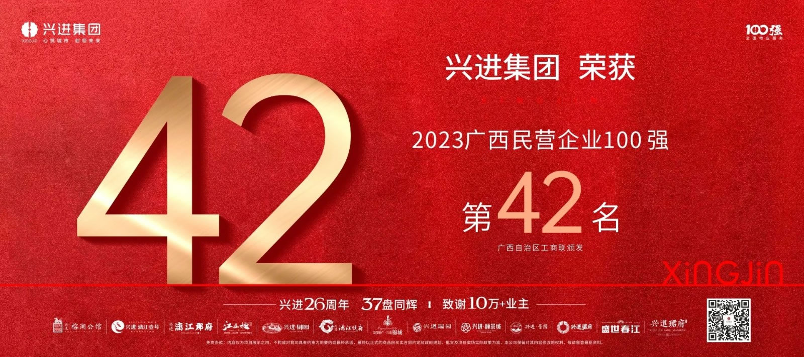 26年,興進(jìn)見證了地產(chǎn)行業(yè)從萌芽走向繁華,也經(jīng)歷一次次大浪淘沙,一輪一輪市場鑒證,一步步走到現(xiàn)在。更是憑借穩(wěn)健的兌現(xiàn)力、優(yōu)秀的服務(wù)力和極高的業(yè)主口碑,在廣西全行業(yè)企業(yè)的激烈競爭中,榮膺"2023廣西民營企業(yè)100第42名"的榮譽(yù)。(廣西自治區(qū)工商聯(lián)頒發(fā))