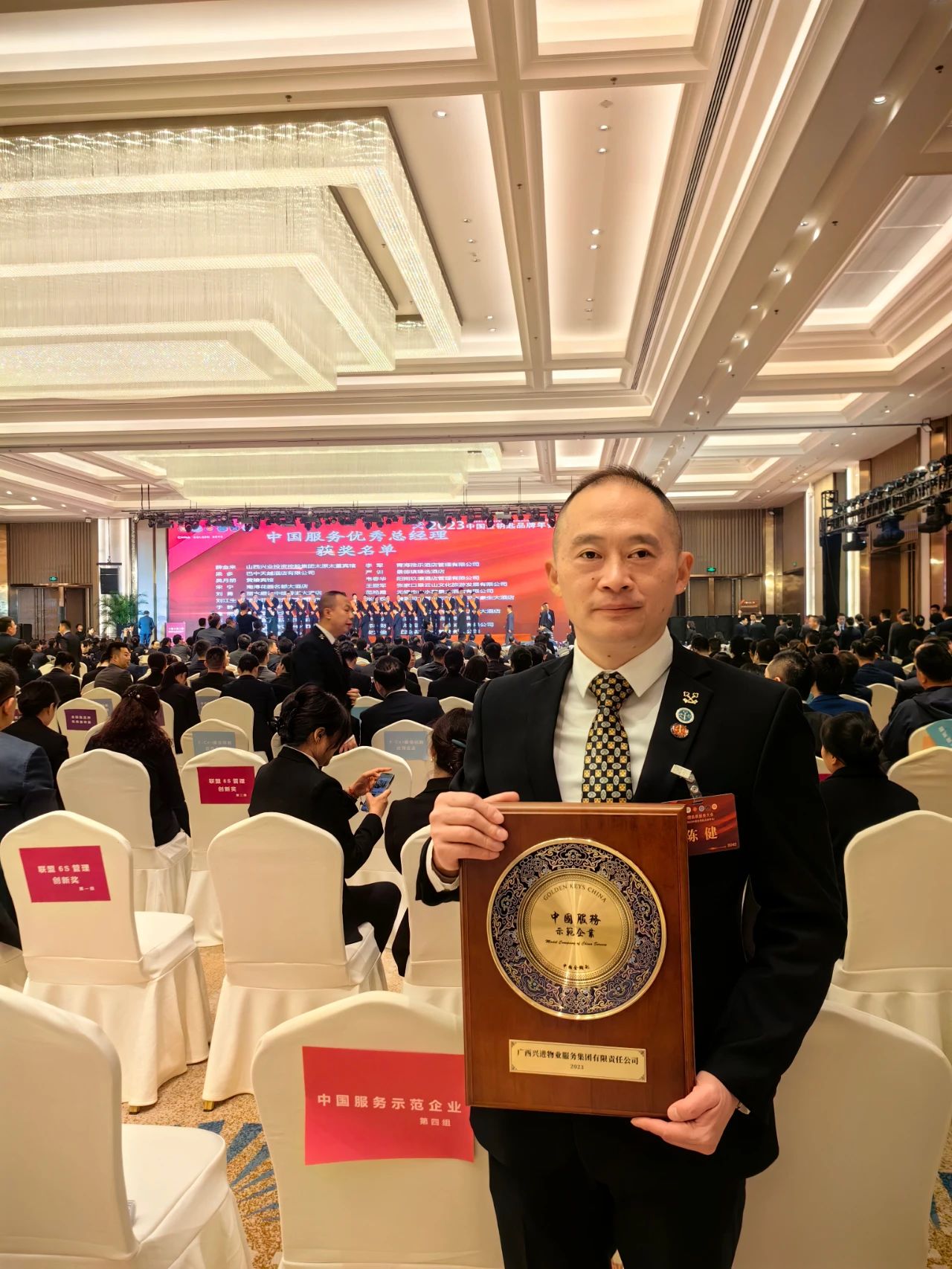 興進(jìn)服務(wù)集團(tuán)人力行政總監(jiān)陳健先生(右)與中國金鑰匙主席孫東先生(左)現(xiàn)場(chǎng)合影 經(jīng)金鑰匙聯(lián)盟成員企業(yè)申報(bào)及聯(lián)盟總部綜合評(píng)定,興進(jìn)服務(wù)集團(tuán)憑借高品質(zhì)、高標(biāo)準(zhǔn)的物業(yè)服務(wù),榮獲2023年度金鑰匙國際聯(lián)盟"中國服務(wù)示范企業(yè)",集團(tuán)總經(jīng)理王永忠先生獲"優(yōu)秀總經(jīng)理"稱號(hào),興進(jìn)漓江郡府、漓江壹號(hào)獲"優(yōu)秀服務(wù)團(tuán)隊(duì)"榮譽(yù)稱號(hào)。