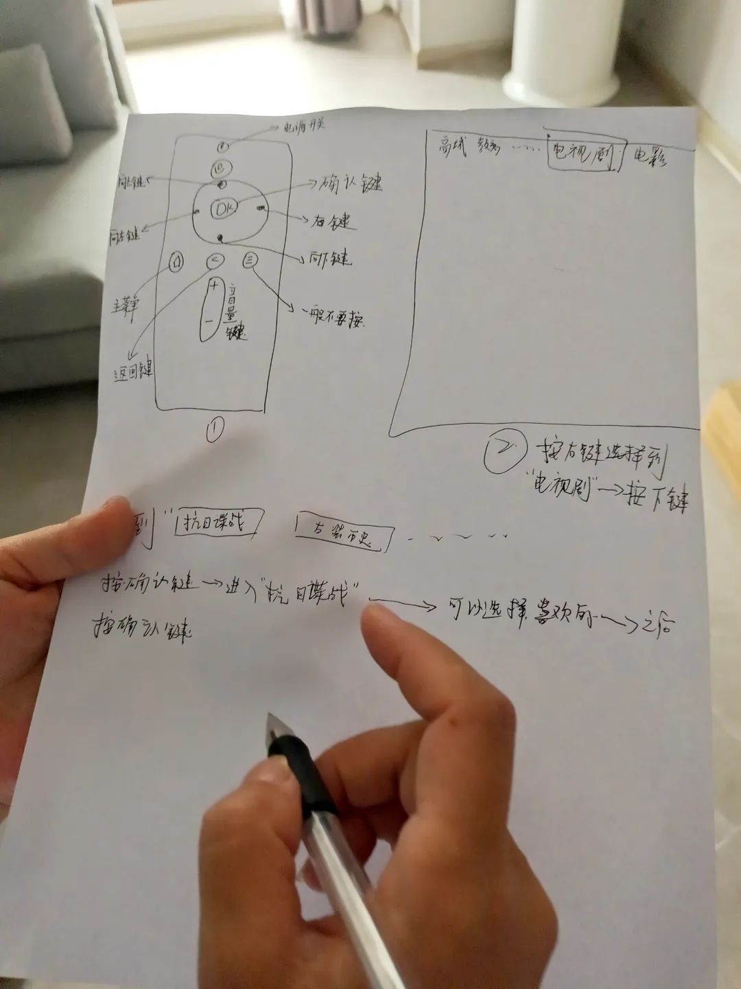 老人年紀(jì)大了,記性不好,總會(huì)忘記怎樣使用電視遙控器。楊瑾婷一遍又一遍地教老人使用遙控器控制電視,還手繪了遙控器使用示意圖,標(biāo)注好每個(gè)按鍵的功能。