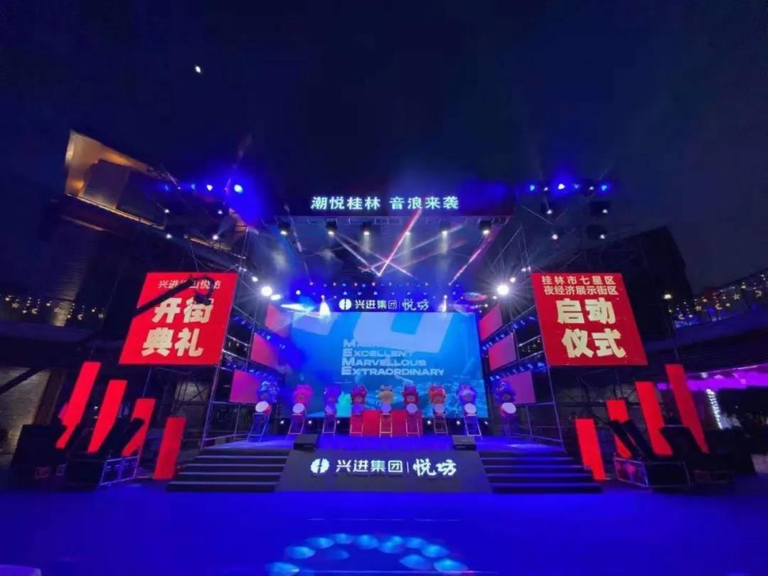 19時38分,啟動儀式正式開始。桂林市委常委、常務(wù)副市長彭代元,高新區(qū)管委會主任、七星區(qū)委書記石玉琳,七星區(qū)人民政府區(qū)長鄭平,桂林市商務(wù)局副局長呂佳軍,興進(jìn)集團(tuán)董事長羅欣,興進(jìn)集團(tuán)副總裁羅捷依次上臺。