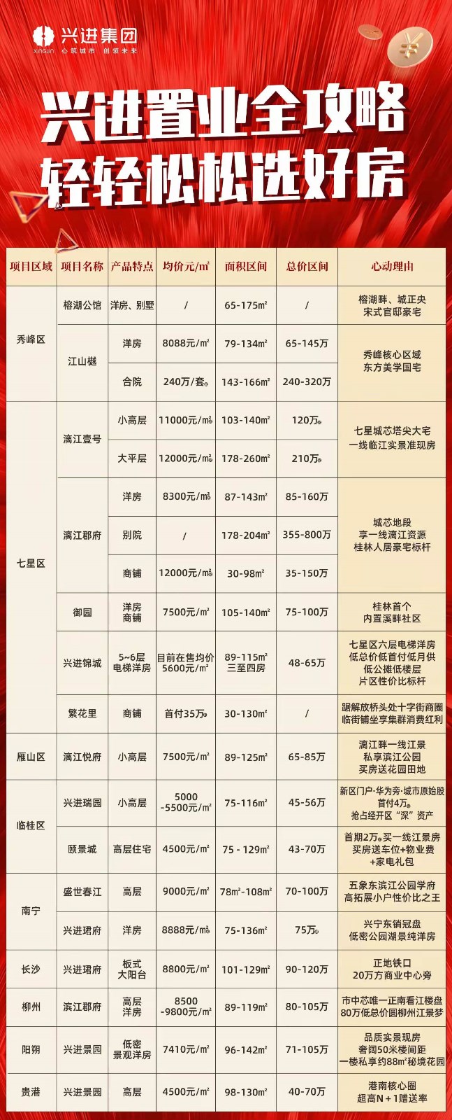 作為深耕桂林24年的本土房企,興進集團熟悉桂林人的居住喜好,憑借全國一級開發(fā)資質(zhì)的實力,堅持走精品路線,并以全國百強物業(yè)的貼心服務(wù),打造出許多桂林有口皆碑的高端項目。